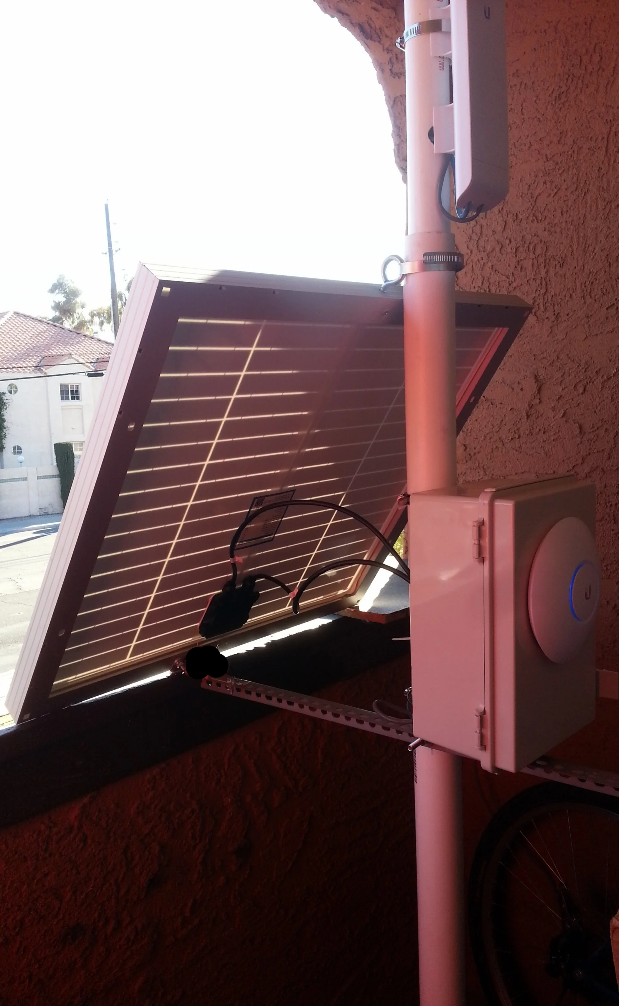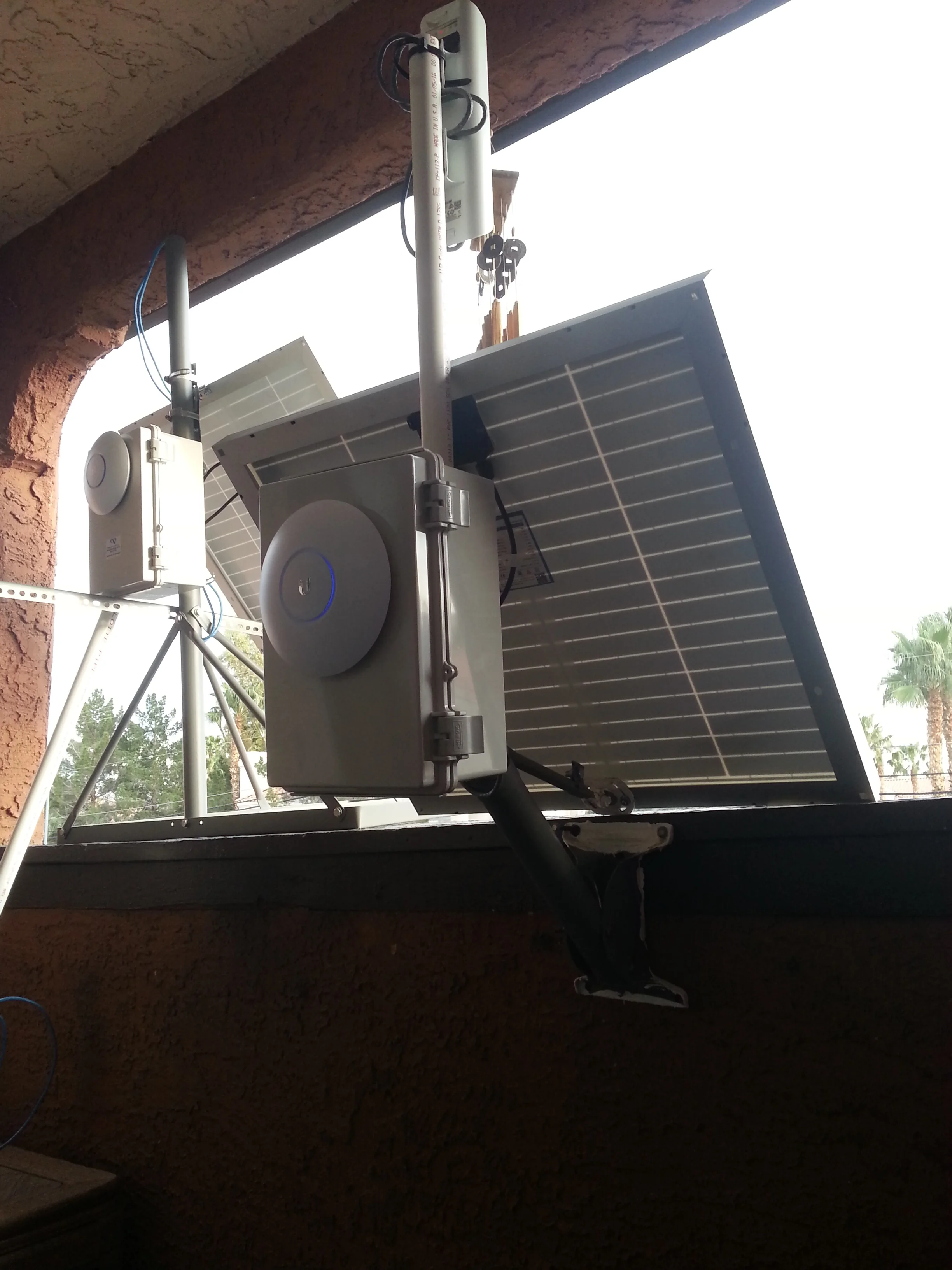 The SolarLynk is the FreeLynk user's connection to the internet. It uses its long range PTMP antenna on top to broadcast and receive internet connection. The attached access point creates the WiFi network for users to see and interact with. It's solar panel and battery allow it to run rain or shine.