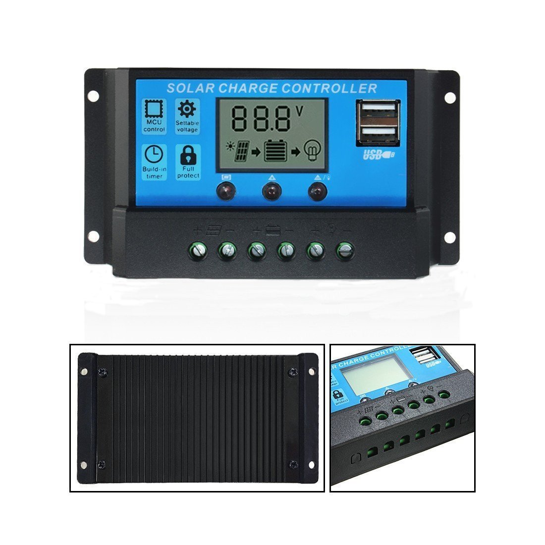 Solar Controller for handling the incoming solar power and regulating the battery correctly. The USB ports on the front can be very handy for lots of reasons as well.