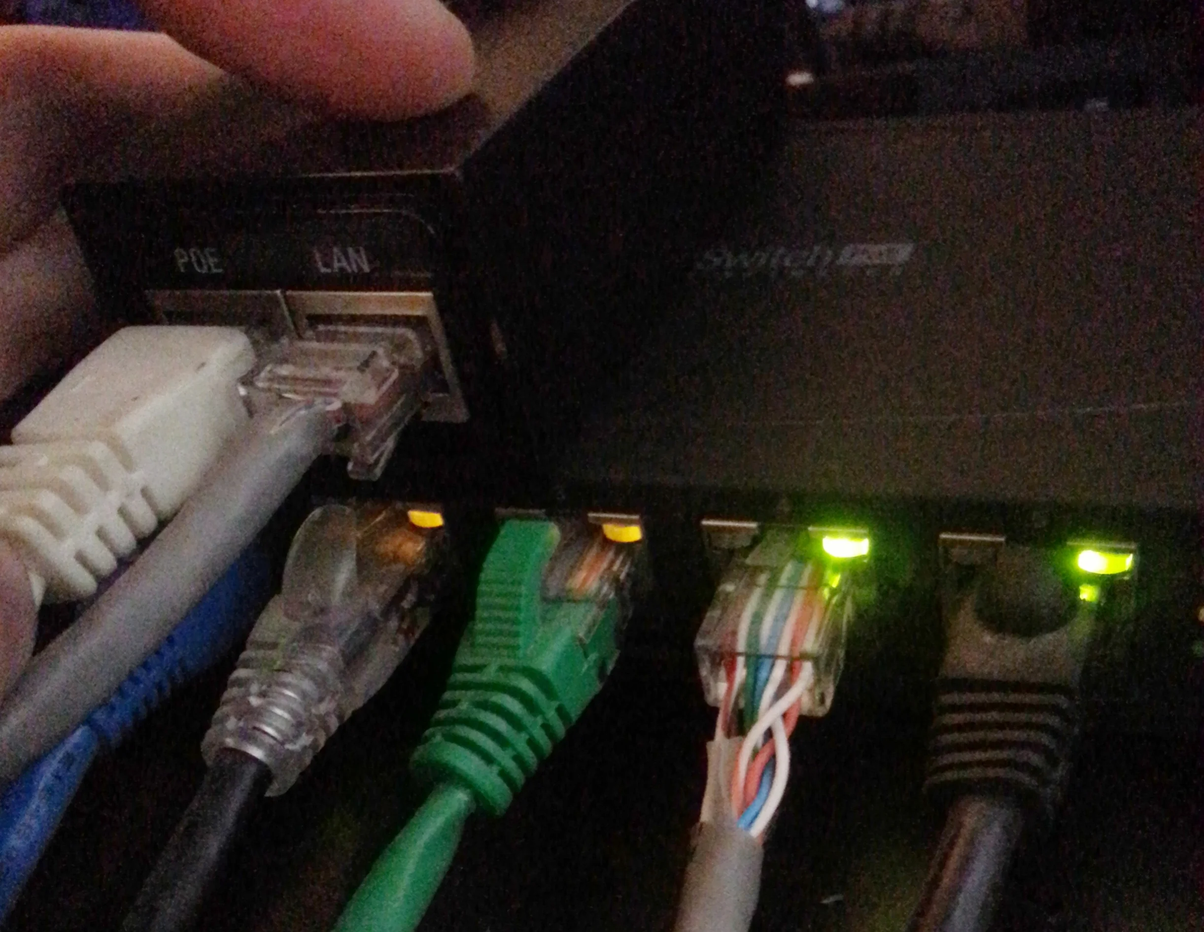 1. Begin by connecting our injector an open port on either your toughswitch or edgerouter. In this example we're using port 4 in our switch, which is connected to the LAN port on our 24v 0.5A gigabit ethernet power injector. Connect the POE port on the injector to our Rocket radio as shown below.